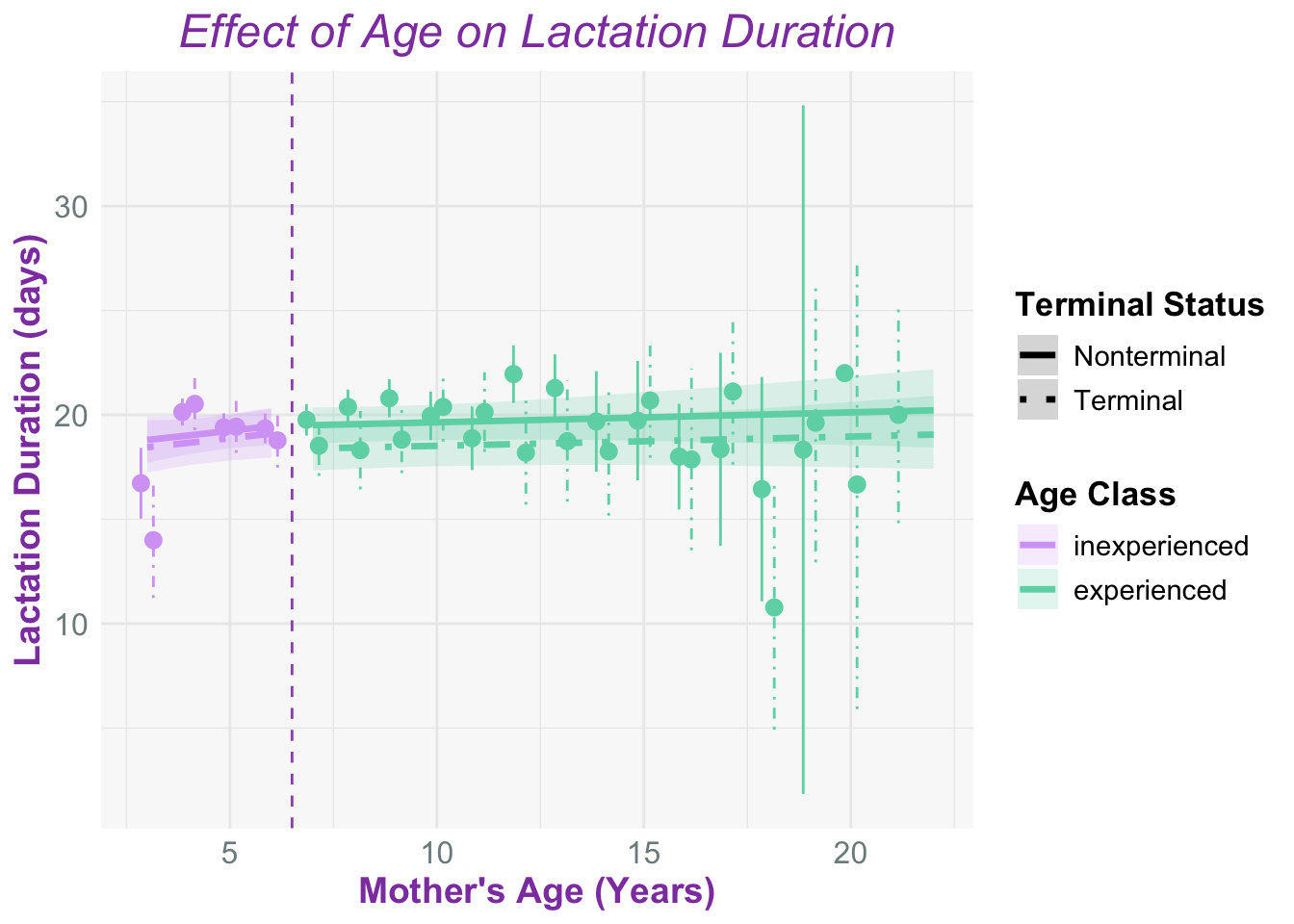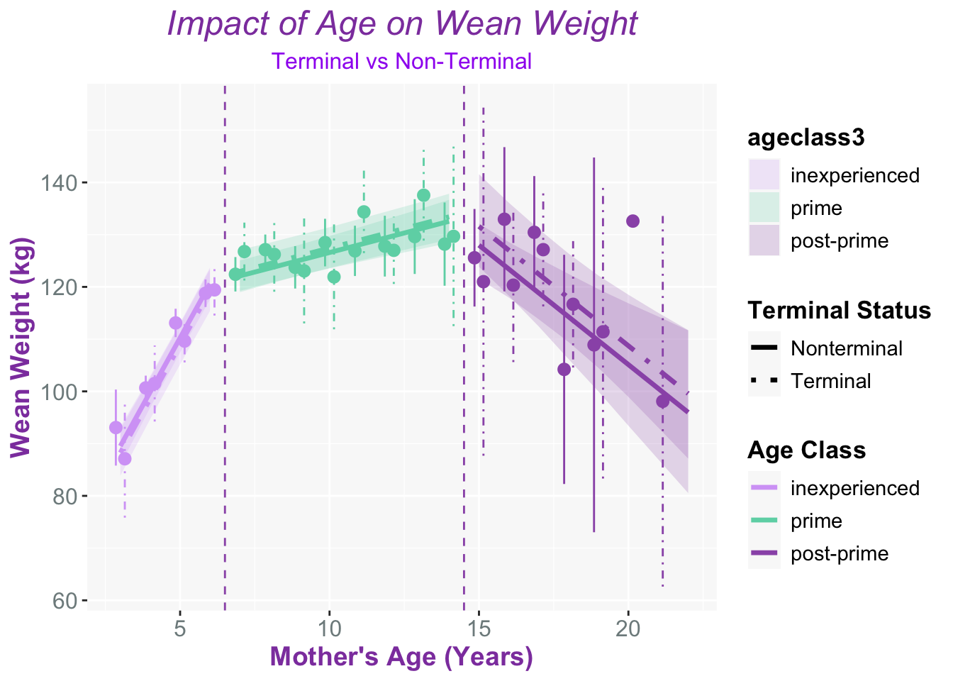 The interaction between terminal status and age class is weak overall, for some reason, there is a very large negative and highly uncertain estimate for the post-prime moms (Est: –420 ± 551), which suggests an the effect can be unstable or just highly uncertain